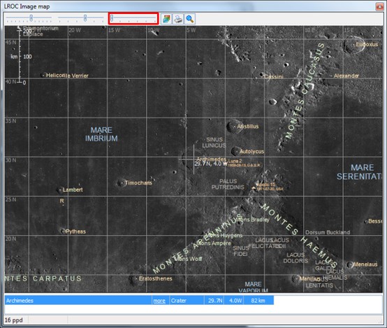 The LROC image map program module provides an interactive image map of the lunar surface in plate carée projection. The map is based on images taken by NASA's Lunar Reconnaissance Orbiter Camera (LROC). The image is currently available in five resolutions (zoom levels): 16, 24, 32, 48 and 64 pixels per degree (~1895 .. 474 meters per pixel in latitudinal direction).
