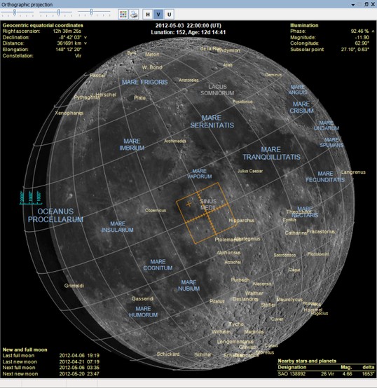 The orthographic projection shows the visual appearance of the lunar disc as seen by an (fictional) observer at the center of the Earth (in geocentric mode) or as seen from an observer at the surface of the Earth (in topocentric mode) at the observation time. The projection is created with respect to the illumination of the lunar surface by the Sun and corrected for geocentric / topocentric libration and and the parallactic angle (in topocentric mode). The projection also allows the visualization of eclipses, occultations and appulses.