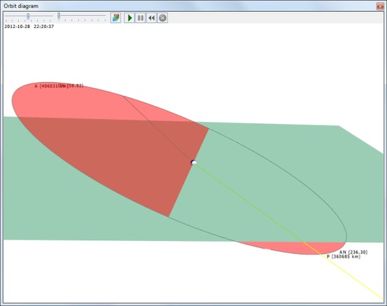 The orbit diagram program module shows a three-dimensional geocentric visualisation of the lunar orbit. It shows
