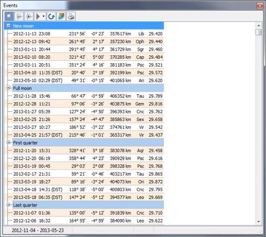 By default, the ephemeris calculation is performed for the Moon only, but a reference body (the Sun, a planet or a fixed star) can be specified, for which also ephemeris data and angular separation from the Moon are calculated. In addition the ephemeris module offers plotting ephemeris data (as a function of time), data export (Excel, CSV), and printing. Access to the complete Bright Star Catalogue and calendar conversion are available.