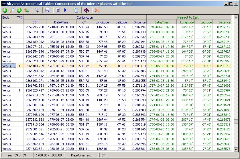 Screenshot: Inferior conjunctions of Venus 1700-1800