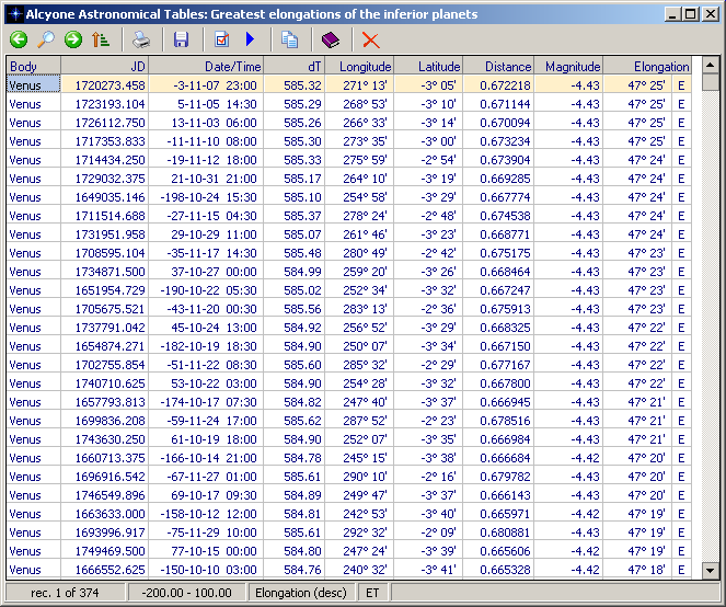 Screenshot: Greatest elongations of Venus 201 BC - 101 BC