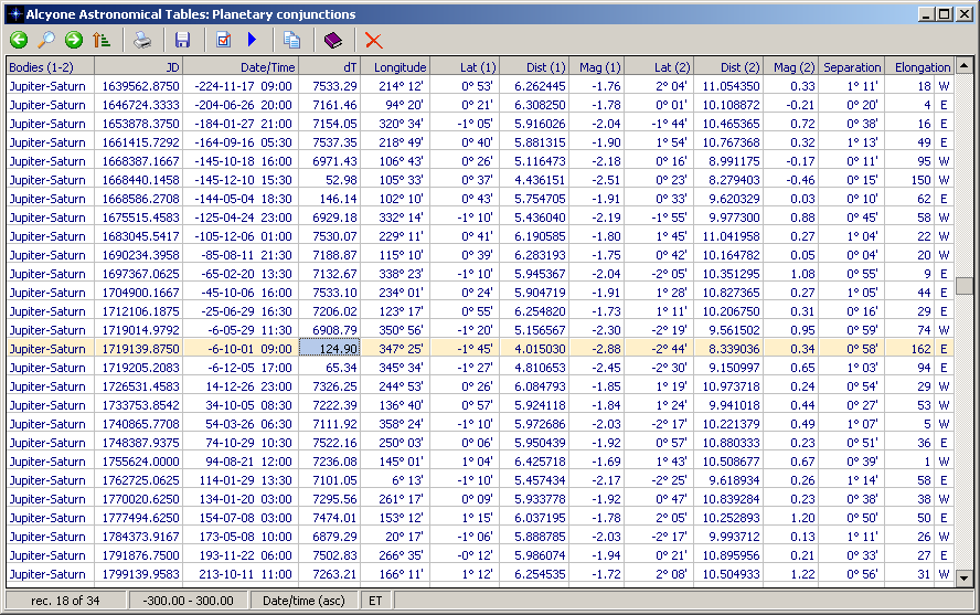 Screenshot: Geocentric conjunctions between Jupiter and Saturn 301 BC - AD 300